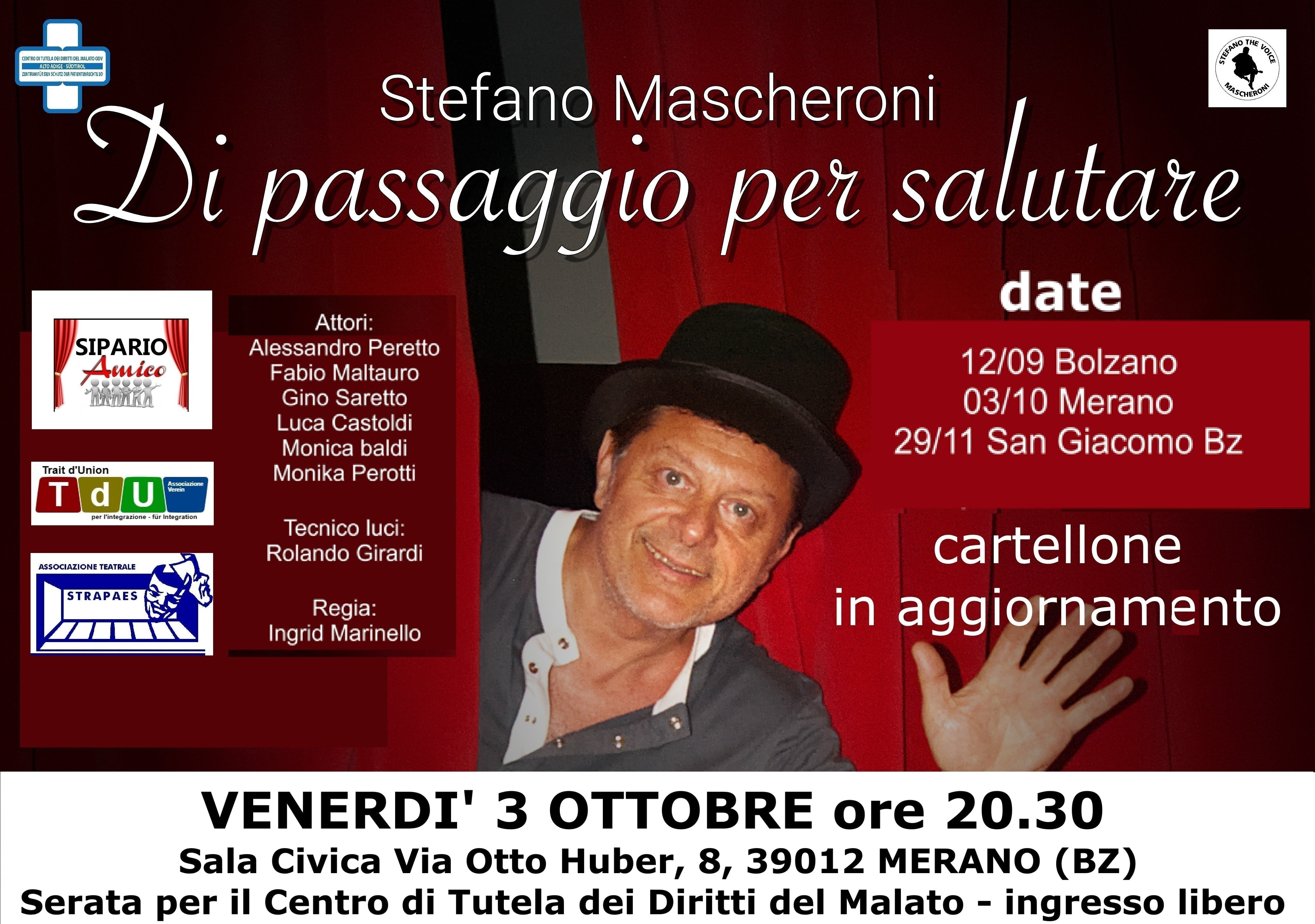 Venerdì 3 ottobre 2025 alle ore 20.30 presso la Sala Civica in Via Otto Huber 8 a Merano, si terrà il concerto-recital di STEFANO MASCHERONI dal titolo "Di passaggio per salutare" . Lo spettacolo è organizzato da CMG Records Italy con il sostegno di Sipario Amico e Trait d'Union e vede la collaborazione dell'associazione teatrale STRAPAES. L'ingresso allo spettacolo è libero e gratuito con possibilità di offerta libera e sarà possibile avere copia dell'ultimo CD dell'artista con una piccola donazione che sarà interamente devoluta al Centro di Tutela dei Diritti del Malato Alto Adige.